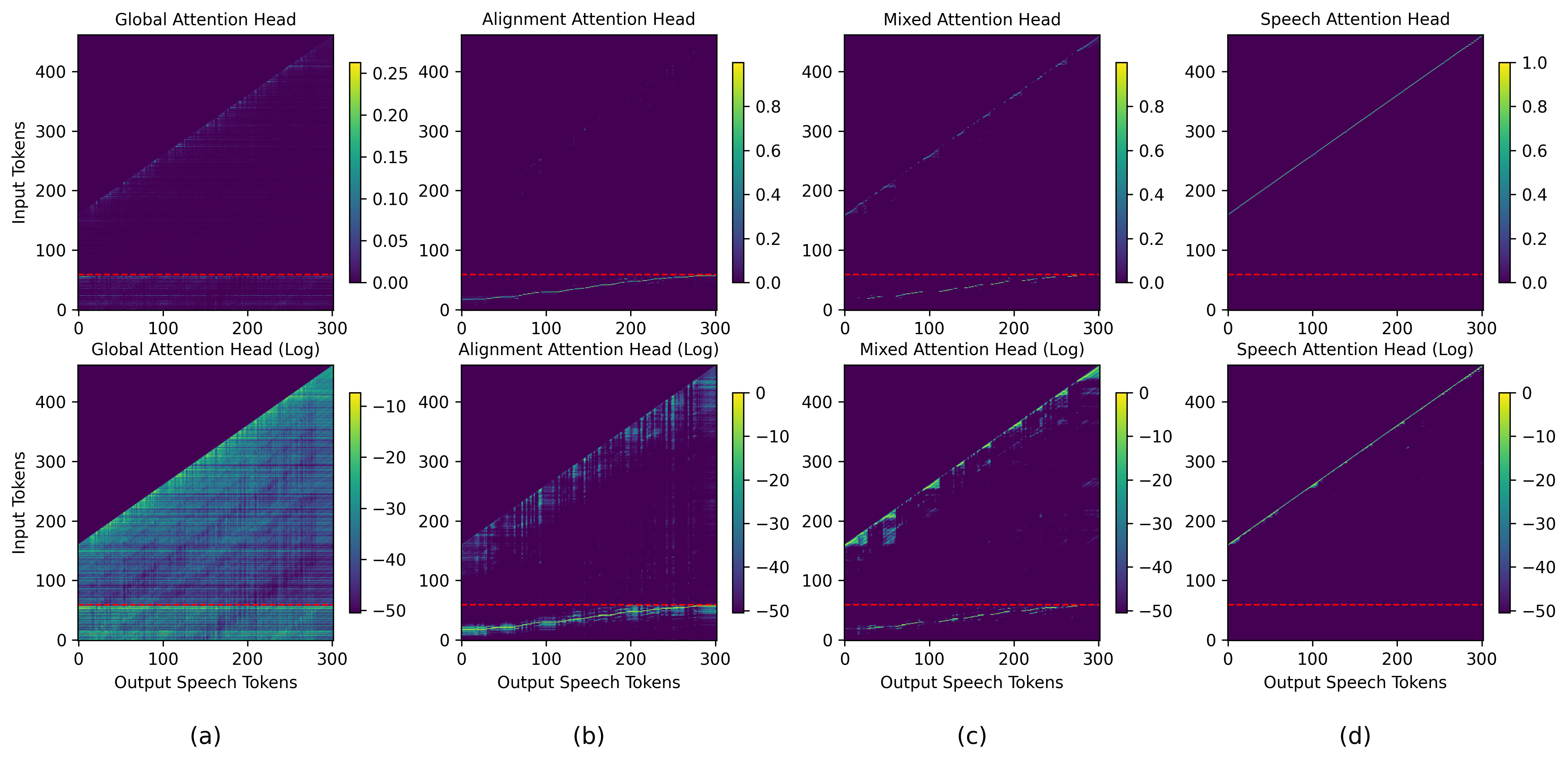 Visualization of attention probability for the four types of attention heads in CosyVoice2. The first row shows the original attention probability, while the second row presents the logarithmic version, enabling more intuitive observation of the regions attended to by the attention head. The red dashed line indicates the boundary between text tokens and speech tokens in the input sequence, with text tokens below the boundary and speech tokens above it.